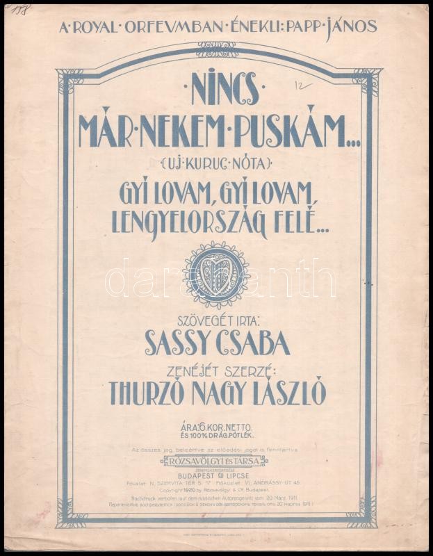 1911. Thurzó Nagy László: Nincs már nekem puskám; Gyí lovam, gyí lovam, Lengyelország felé. Szöveg: Sassy Csaba. Bp., Rózsavölgyi és Társa.
