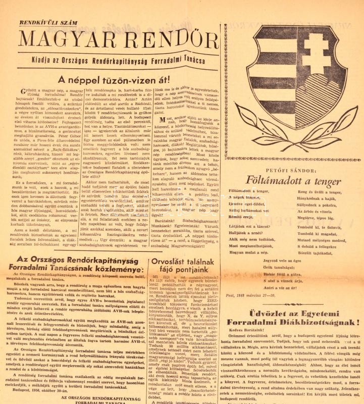 1956 Magyar Rendőr. Rendkívüli szám., 1956. okt. 30., Kiadja: Országos Rendőrkapitányság Forradalmi Tanácsa. Szerk.: András Endre., 2 sztl. lev.