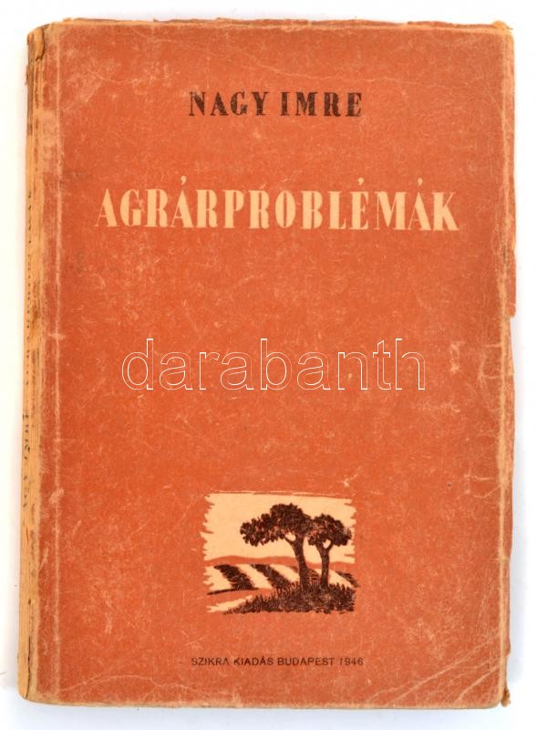Nagy Imre: Agrárproblémák. Tanulmányok - bírálatok. 1938-1940. Bp., 1946, Szikra, 197+3 p. Kiadói papírkötésben, kopott, viseltes papírborítóban, intézményi bélyegzővel, de belül jó állapotban. Nagy Imre (1896-1958) politikus, miniszterelnök (1953-1955, 1956), korábban földművelésügyi (1944-1945), majd belügyminiszter (1946-1948), 1956-os vértanú, ritka, korai műve, amelyet Magyarországra való visszatérése után adott ki. A mű kivégzése után indexre került, és (ezt a példányt leselejtezték.)