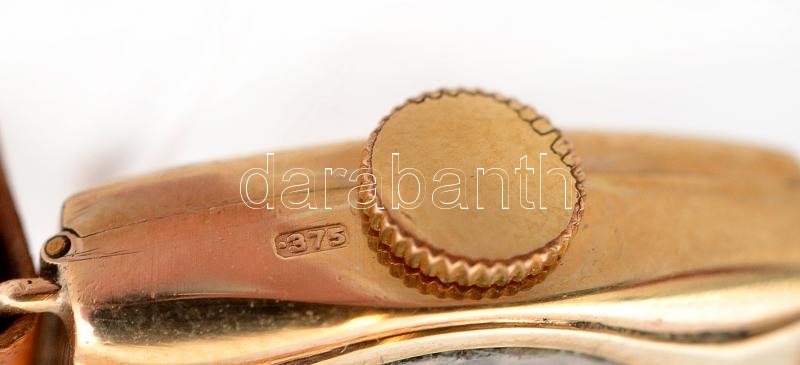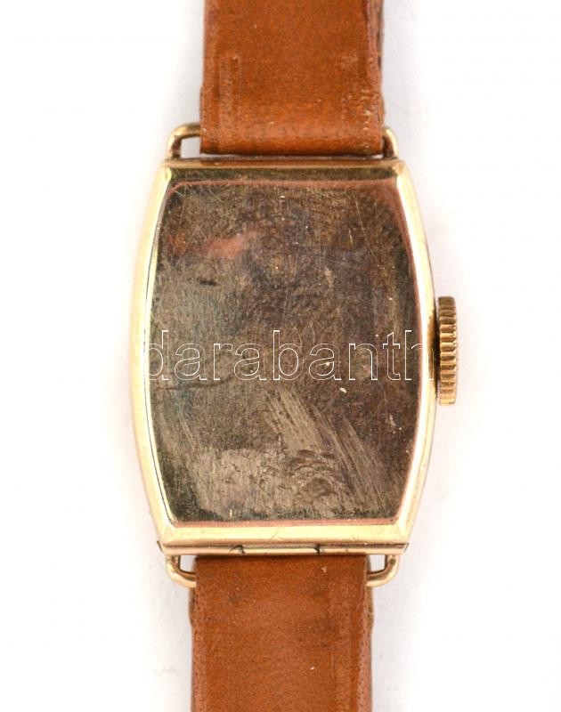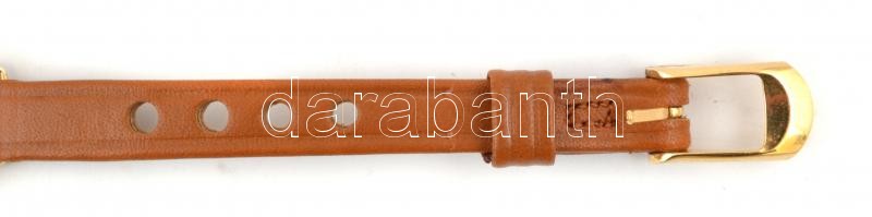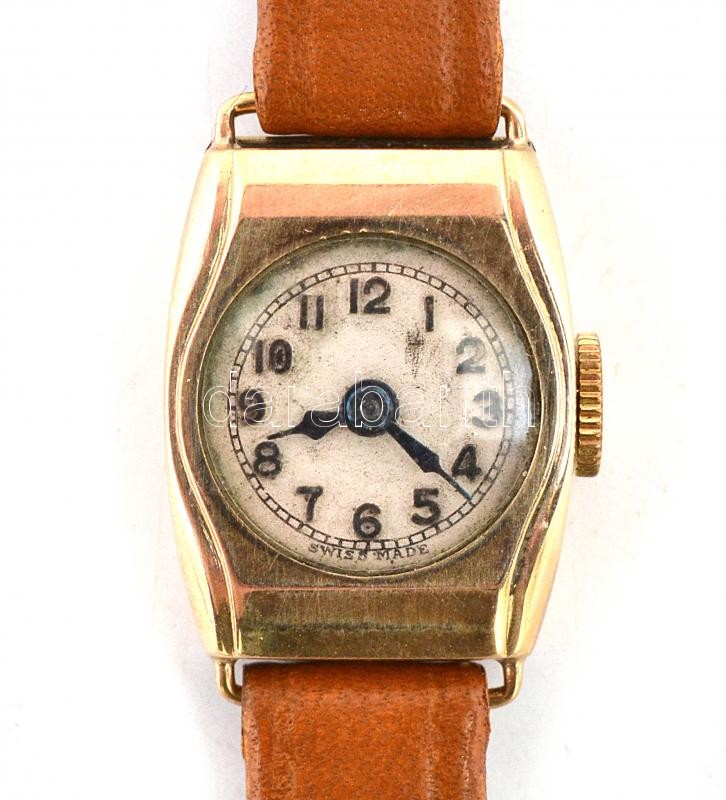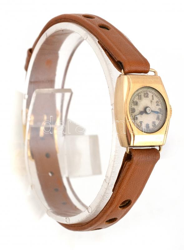 Arany (Au) 8K női karóra, mechanikus, jelzett, jár, bőr szíjjal, kissé koszos számlappal, 1,9×1,6 cm, bruttó: 8,8 g