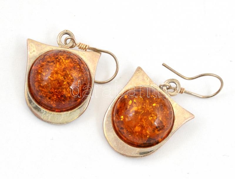 Ezüst(Ag) fülbevalópár, borostyán díszítéssel, jelzett, h: 2,5×2 cm, bruttó: 8,4 g