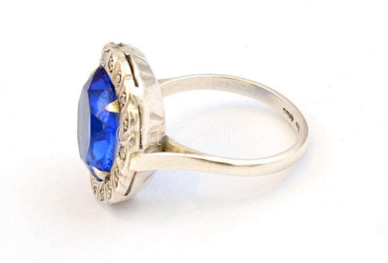 Ezüst(Ag) kék köves gyűrű, markazitokkal, jelzett, méret: 60, bruttó: 6,28 g