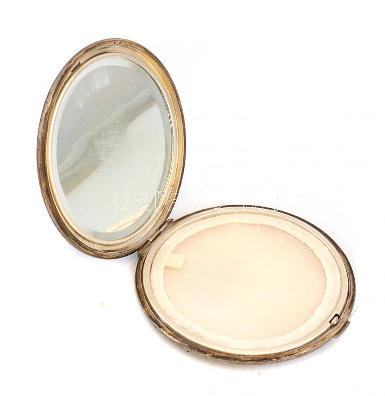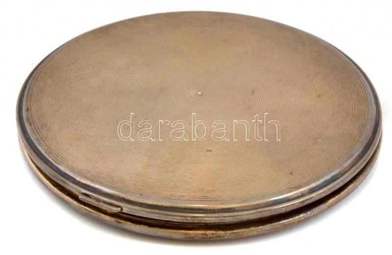 Ezüst(Ag) pudrié, jelzett, belül tükörrel, kívül gravírozott felirattal, d: 9,5 cm, bruttó: 163,3 g