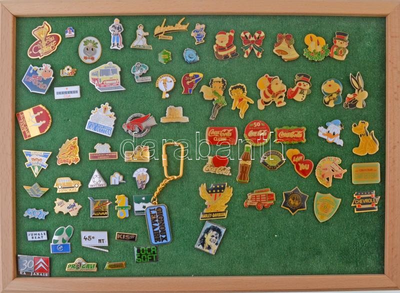 71db modern jelvény, fakeretes jelvénytartó tálcán, közte több Coca-Colás és rajzfilm-figurás jelvény (360x263mm) T:1-2