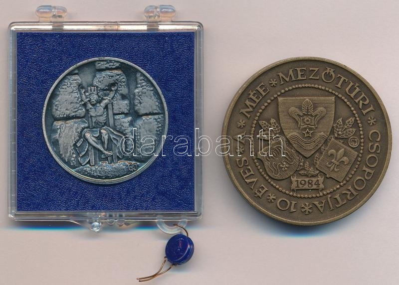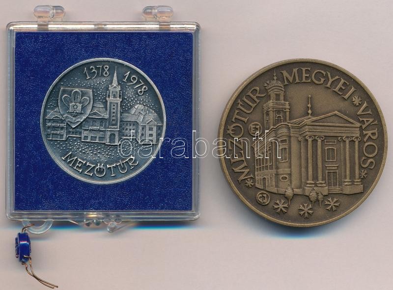 Garamkeszi János (1936- ) 1978. "Mezőtúr 600 éves / Dózsa György" ezüstözött Br emlékérem sérült, plombált ÁPV tokban (32mm) + 1984. "Mezőtúr megyei város / 10 éves a MÉE Mezőtúri Csoportja" Br emlékérem (42,5mm) T:1-