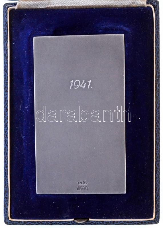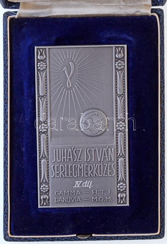 Description: 1941. "JUHÁSZ ISTVÁN SERLEGMÉRKŐZÉS IV.díj GAMMA - H.T.I., DANUVIA - M.O.M." Zn labdarúgó díjérem eredeti dobozában, "BERÁN N. BUDAPEST DÖBRENTEI U. 2." gyártói jelzéssel (100x55mm) T:1-