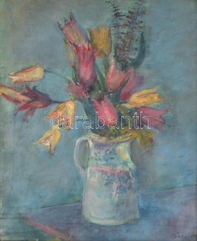 Description: Czinkotay Frigyes (1932-2018): Tulipános csendélet. Olaj, farost, jelzett, hátoldalán a művész névjegyével, üvegezett, kissé sérült fa keretben, 60x50 cm
