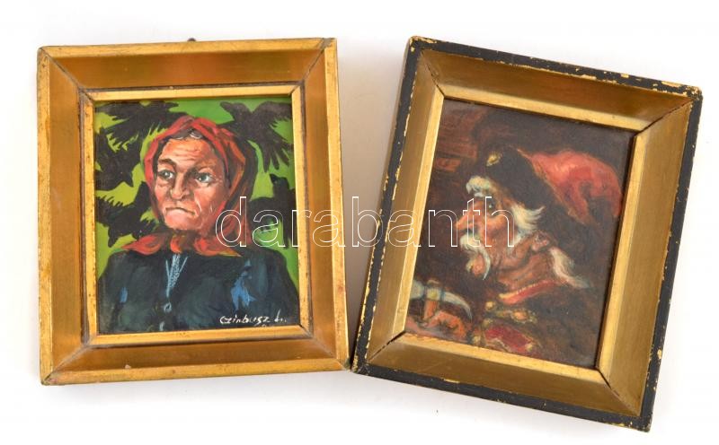 Description: Czirbusz László (?-), 2 db mű: Katona fokossal és nő kendőben. Vegyes technika, farost és fa. Jelzett, hátoldalán címkével, keretben. 10x8,5 és 10,5x8,5 cm.
