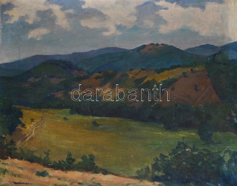 Winter (?) jelzéssel: hegyvidéki táj. Olaj, vászon, javított sérüléssel (szakadással), 50×60 cm