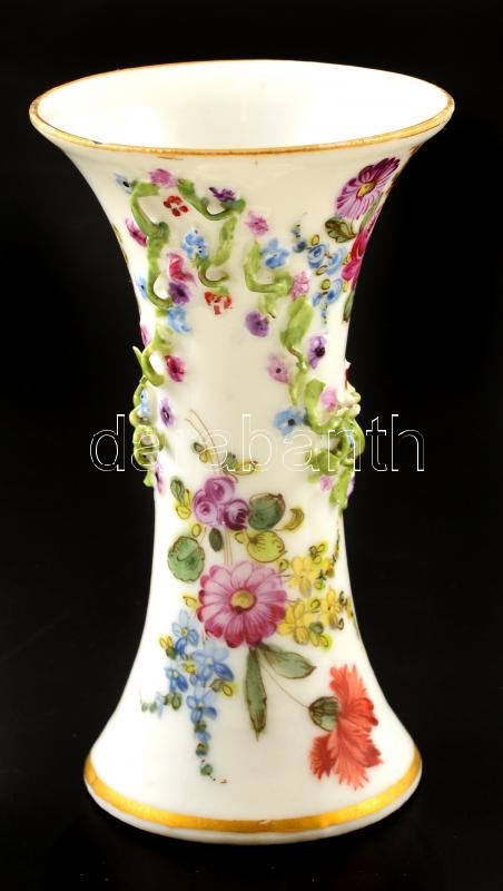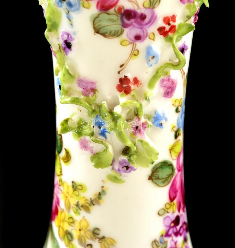 Virágos kis váza, sérült, kézzel festett, jelzett (két kard EC), m: 11...
