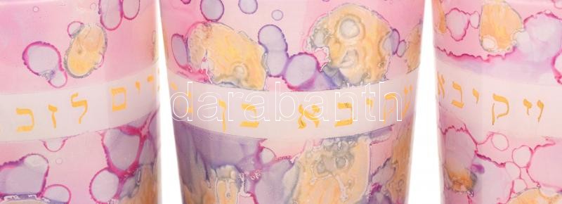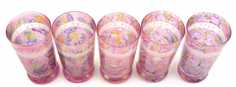 5 db héber feliratos festett üvegpohár, kis kopásnyomokkal, m: 12,5 cm