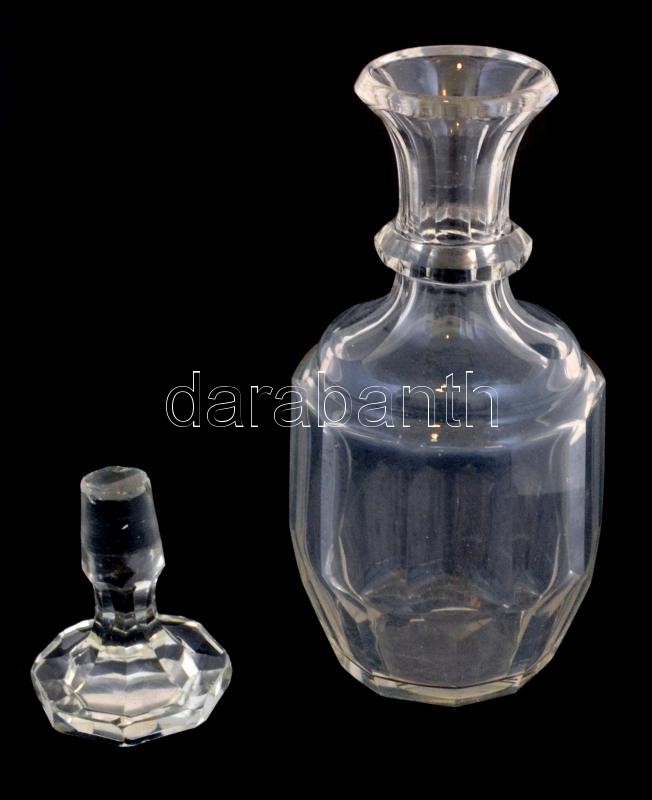 Színtelen üveg kiöntő, dugó alján csorbákkal, üveg alján karcolásokkal, m: 24 cm