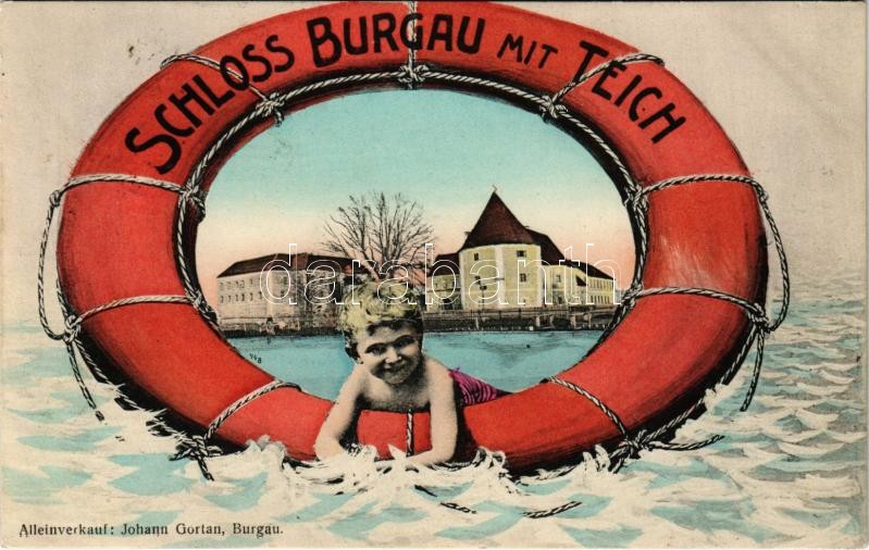 1912 Burgau (Steiermark), Schloss Burgau mit Teich. Johann Gortan / castle. Montage with boy and rubber ring