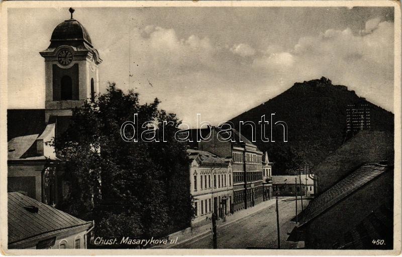 1939 Huszt, Chust, Khust; Masarykova ul. / utca, templom, vár. Bogatyrev kiadása / street view, church, castle (EK)