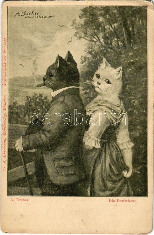 Die Dorfschöne / Gentleman cat with lady cat. Fr. A. Ackermann Kunstverlag Künstlerpostkarte No. 1077. s: A. Dreher (kopott sarkak / worn corners)