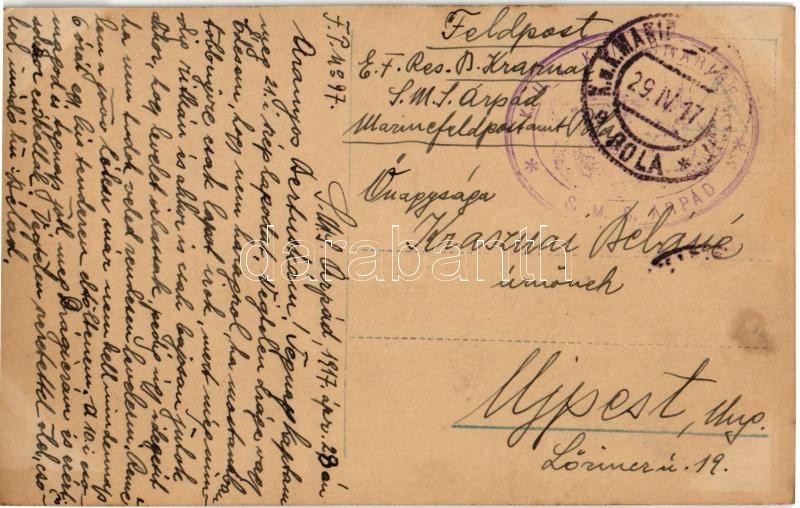 Description: 1917 Kronprinz Otto / Crown Prince Otto, son of Charles I of Austria. Kardos Nővérek, Budapest 1916. 6126. + "K.u.K. Kriegsmarine SMS Árpád" "K.u.K. Marinefeldpostamt Pola" (fl)