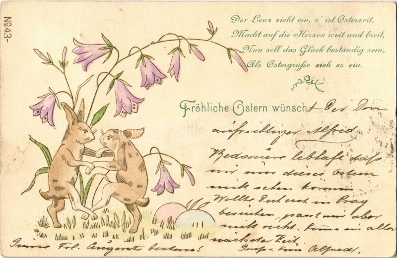 1899 Fröhliche Ostern wünsch / Easter greeting, dancing rabbits. Emb. No. 43.