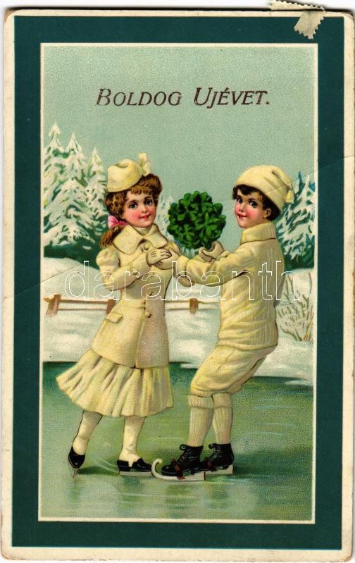 1912 Boldog Újévet! / New Year greeting with ice skating couple, winter sport. S.B. 2282. litho (fa)