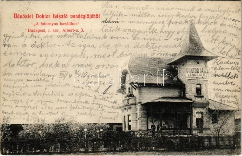 https://www.darabanth.com/en/374-Online-auction/374.0/Postcards/Hungary~2000004/1912-Budapest-XI-Doktor-Laszlo-vendegloje-a-Fatornyos-hazadhoz-etterem-Albert-utca-3-EK~II2191960