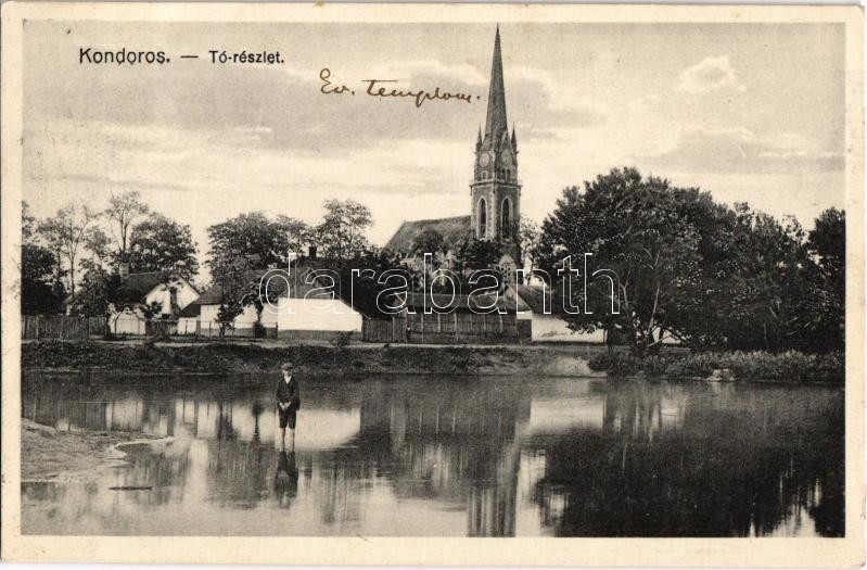 1927 Kondoros, Tó részlet, Evangélikus templom. Kiadja a Hangya Szövetkezet