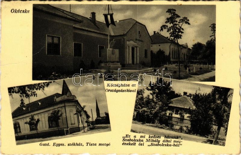 Description: 1940 Tiszakécske, Ókécskei Községháza az Országzászlóval, Gazdasági Egyesület székháza, Tisza mozgó (mozi), "Ez a mi kedves házunk" Szabolcska Mihály által megénekelt ősi "Szabolcska-ház". Hangya Szövetkezet kiadása (gyűrődés / crease)