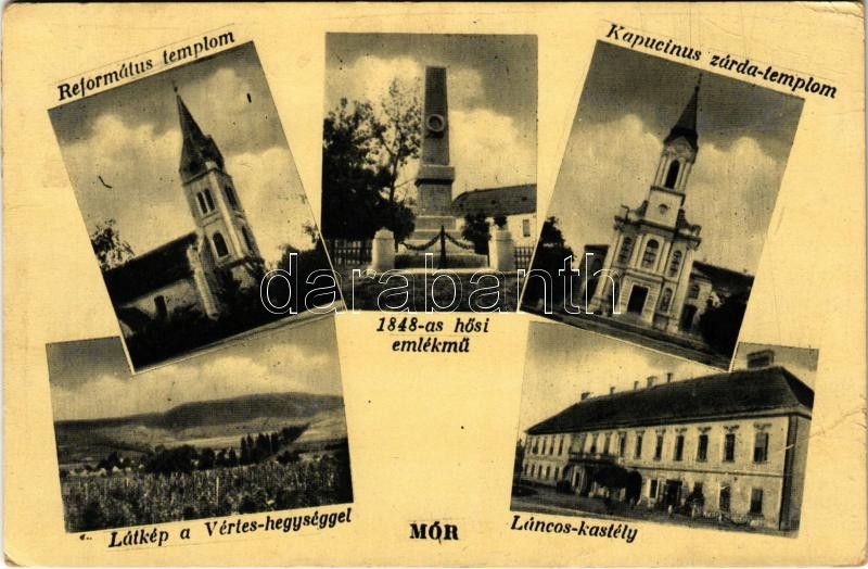 1949 Mór, Református templom, 1848-as hősi emlékmű, Kapucizus zárda-templom, látkép a Vértes hegységgel, Láncos kastély (EB)