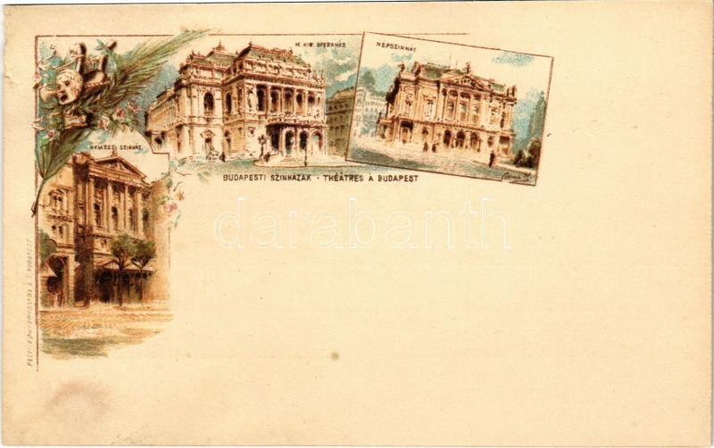 Budapest, Ezredéves Országos Kiállítás, Budapesti színházak, Nemzeti Színház, Népszínház, M. kir. Operaház. litho barna 2 Kr. Ga. s: Cserna (r)