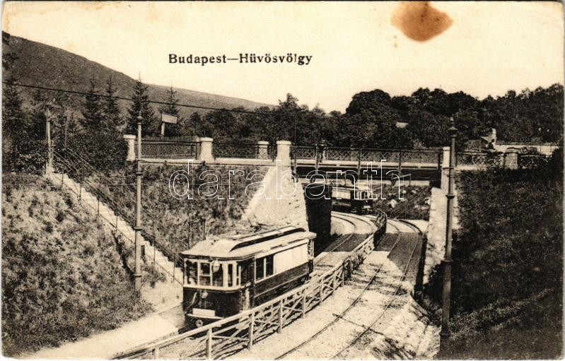 Budapest II. Hűvösvölgy, villamosok a felüljáróval. Vasúti levelezőlap...