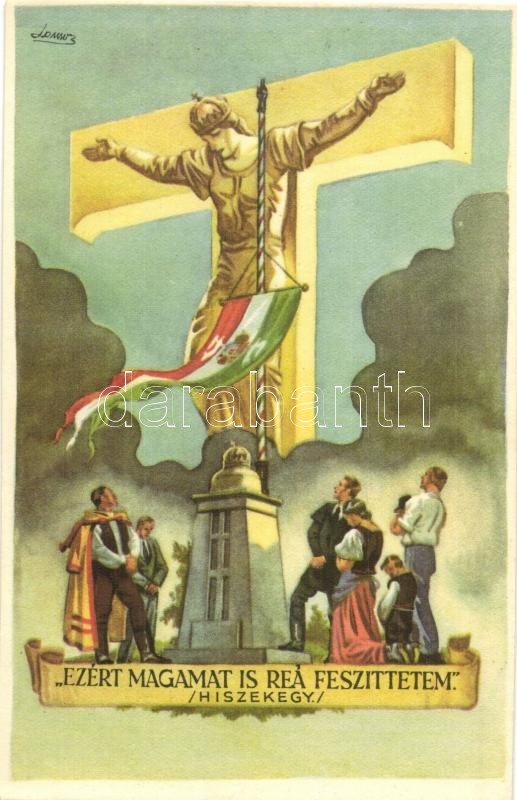Description: Ezért magamat is reá feszíttetem (Hiszekegy). Kiadja az Ereklyés Országzászló Nagybizottsága / Hungarian irredenta propaganda art postcard, Trianon s: Lamoss