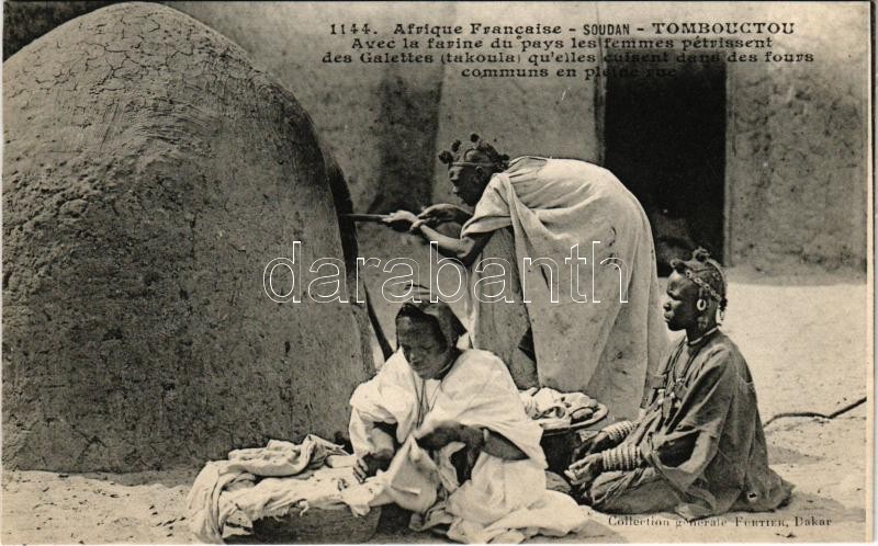Description: Timbuktu, Tombouctou; Avec la farine du pays les femmes pétrissent des Galettes (takoula) qu' elles cuisent dans des fours communs en pleine rue / women bake bread in the oven, African folklore