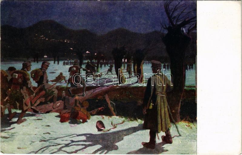 Description: A 30. honvéd gyalogezred éjjeli támadása 1914 november hó 27-ről 28-ra a Kamalj hegyre a Kacer völgyön át. A budapesti 30. honvéd gyalogezred özvegy és árvaalapja javára. Rigler rt. / WWI Hungarian military art postcard s: Juszkó Béla