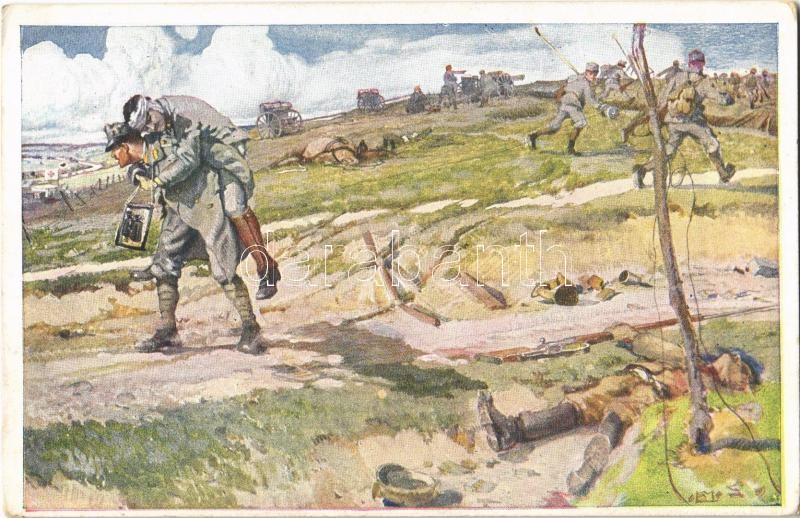 Description: Johann Salawa, Offiziersdiener des k. k. Landwehrinfanterieregimentes Nr. 16. trägt einen verwundeten Offizier im heftigsten Feuer der vordersten Linie zum Verbandplatze. Aus dem goldenen Buche der Armee Serie VI. Aus "Ehrenhalle" Heft 3. Kriegshilfsbüro Nr. 619. / WWI Austro-Hungarian K.u.K. military, injured officer, charity fund, artist signed