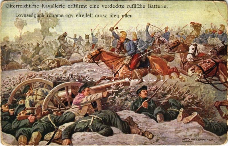 Lovasságunk rohama egy elrejtett orosz üteg ellen / WWI K.u.K. (Austro-Hungarian) military art postcard. B.K.W.I. 259-24. s: Ranzenhofer (EK)