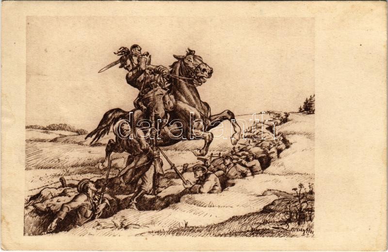 Description: Nagy Károly lovas tiszthelyettes 1914. évi december 9-én Limanovánál orosz vonalon keresztül parancsot visz / WWI K.u.K. (Austro-Hungarian) military art postcard
