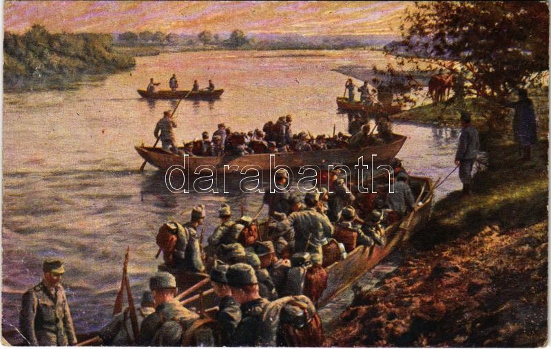 Osztrák-magyar csapatok áthajózása a Wieprz folyón / WWI K.u.K. (Austro-Hungarian) military art postcard (EK)