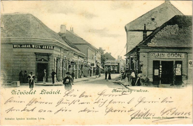 1901 Léva, Levice; Kazinczy utca, Klain Ödön, Weil Jakab, Borcsányi és Csernák üzlete. Schulcz Ignác kiadása / street view, shops (fl)