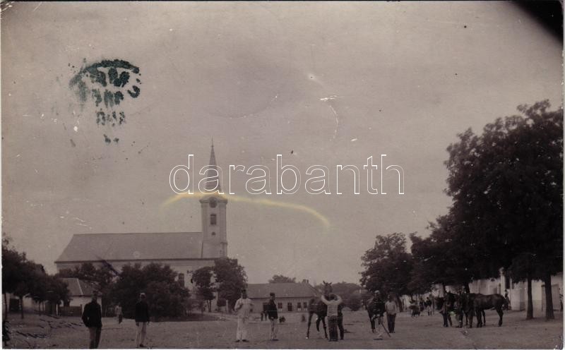 Description: 1905 Kéménd, Kamendin, Kamenin; Római katolikus templom, osztrák-magyar katonák lovakkal / Catholic church, street view, Austro-Hungarian K.u.K. soldiers with horses. photo