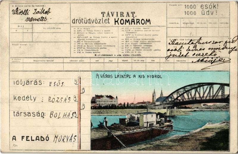 1908 Komárom, Komárnó; Távirat drótüdvözlet, látkép a kishídról. Montá...