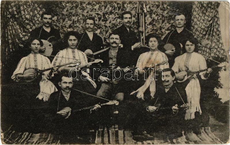 Description: 1912 Mosóc, Mosovce; Tamburasi v Mosovciach / A mosóci tamburás zenekar csoportképe. Hegedűs J. kiadása / tambura music band group picture (gyűrődés / crease)