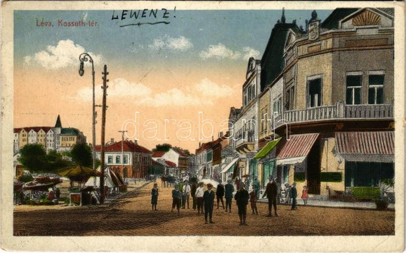 Léva, Levice; Kossuth tér, piac, divatáruház, üzlet / market square, shops (EB)