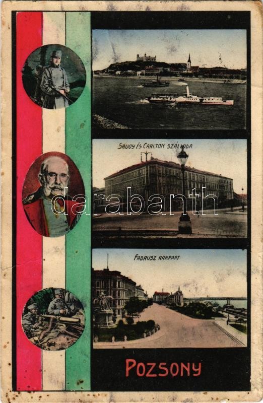Pozsony, Pressburg, Bratislava; gőzhajó, Savoy és Carlton szálloda, Fadrusz rakpart. Szecessziós montázs Ferenc Józseffel és katonákkal, magyar zászló / steamship, hotels, quay. Art Nouveau montage with Franz Joseph, soldiers, Hungarian flag (Rb)