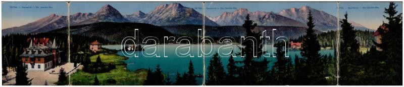 Tátra, Magas Tátra, Vysoké Tatry; Strbské pleso / Der Csorber See / Csorbai tó, 4-részes kihajtható panorámalap. Phot. Nr. 1-3. Kiadja Feitzinger Ede / 4-tiled foldable panoramacard (hajtásnál szakadt / torn at fold)