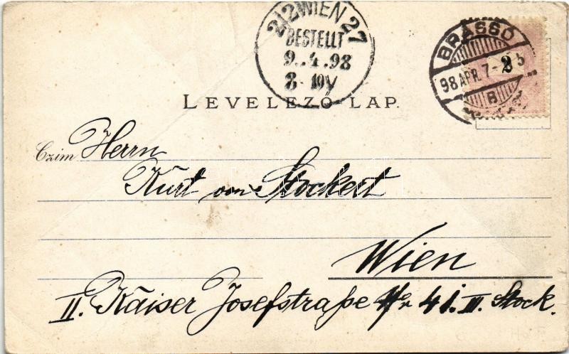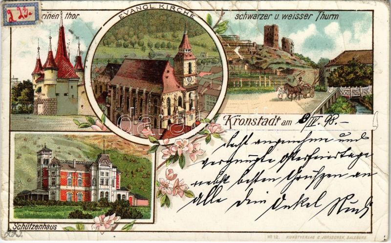1898 (Vorläufer) Brassó, Kronstadt, Brasov; Katalin kapu, Evangélikus templom, Lövölde, Fekete és Fehér torony / gate, church, shooting hall, towers. Kunstverlag C. Jurischek No. 12. Art Nouveau, floral, litho