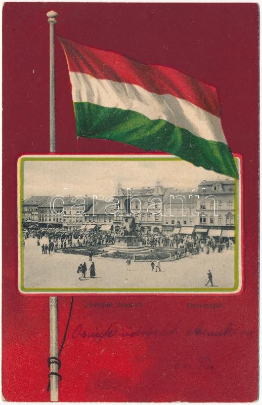 1902 Arad, Szabadság tér, emlékmű, üzletek. Magyar zászlós litho keret...