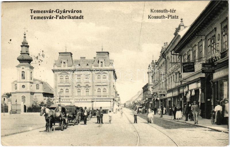 1906 Temesvár, Timisoara; Gyárváros, Kossuth tér, Takarékpénztár, Szána, Csendes és Ficsher, Deutsch Rezső üzlete, villamospálya, lovaskocsik / square, savings bank, shops, tramway, horse-drawn carriages (EK)