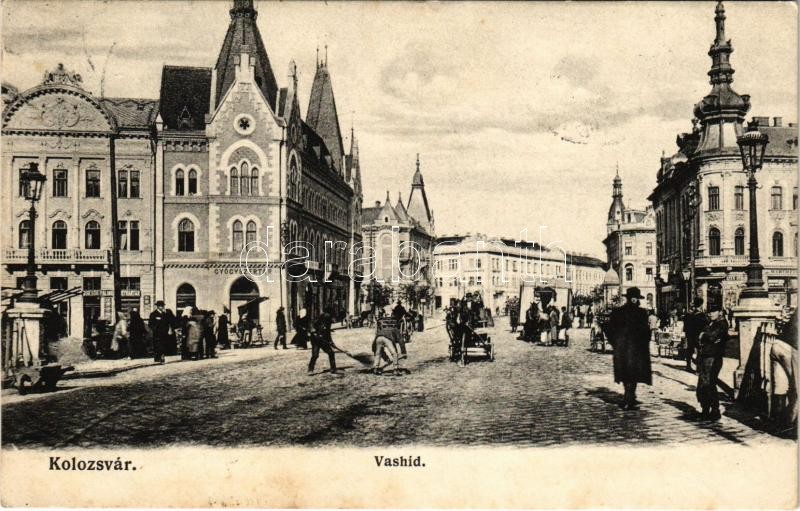 1907 Kolozsvár, Cluj; Vashíd, Gyógyszertár, üzletek, bor, sör és pálinka nagyraktár, Wertheim üzlete, utcaseprők. Schuster Emil kiadása / bridge, pharmacy, shops, street sweepers (fl)