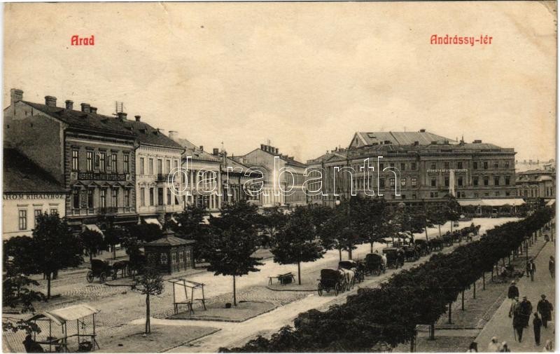 1909 Arad, Andrássy tér, 1848-1849 Múzeum, Verbos A. és Fiai bútorgyára, Martits üzlete, lovaskocsik / square, museum, furniture warehouse, shops, horse-drawn carriages (EK)