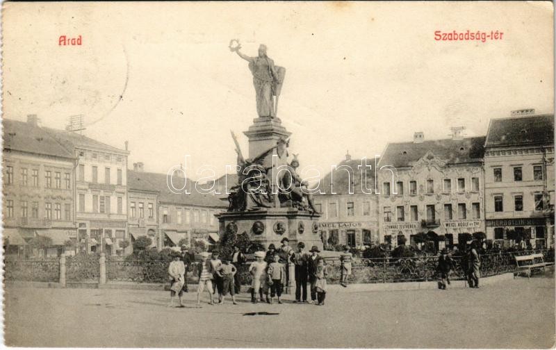 1910 Arad, Szabadság tér, Schwarz Testvérek, Weigl Adolf és társa, Herbstein üzlete, Kereskedelmi bank, emlékmű / square, shops, bank, monument - képeslapfüzetből / from postcard booklet