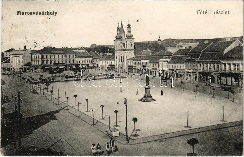 Description: 1917 Marosvásárhely, Targu Mures; Fő tér, Fő tér, Takarékpénztár, Staibl, Mózes Károly üzlete. Porjes S. Sándor kiadása / main square, savings bank, shops