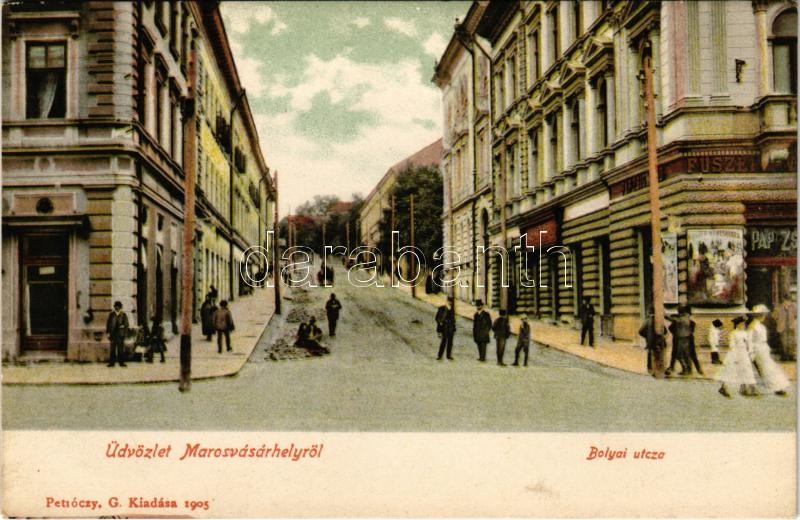 Marosvásárhely, Targu Mures; Bolyai utca, Pap Zsigmond üzlete. Petróczy G. kiadása / street view, shops